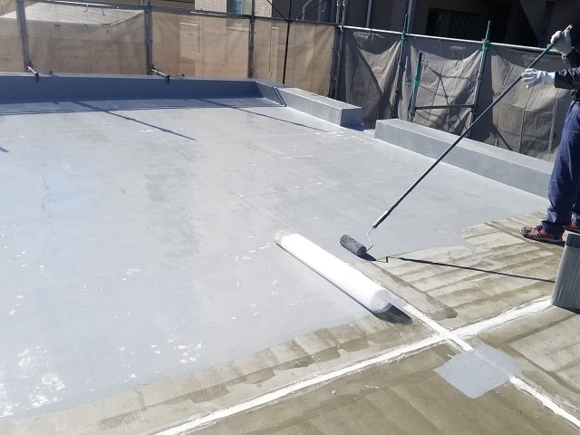公共工事など、予算に余裕がある場合用いる工法です。 下地のプライマーが乾いたら、防水層を形成する工程で、中塗り材(ウレタンゴム)を塗布しながら、間にガラスクロスを張り付けて、亀裂が起こりにくい防水層を形成します。