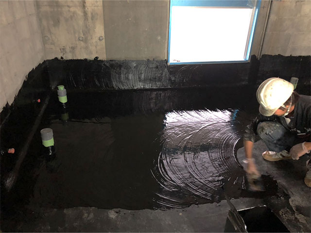 主に、地下や土に面してしまう壁など、表面塗装を行わないような部分には、躯体自体に防水性を与える無機質浸透性防水塗装を行います。コンクリート表面に直接塗ることで内側に浸透し、表面に防水層をつくります。 塗料を浸透させる必要があるため、下地が乾燥状態にある場合は、しっかりと水打ちを行います。