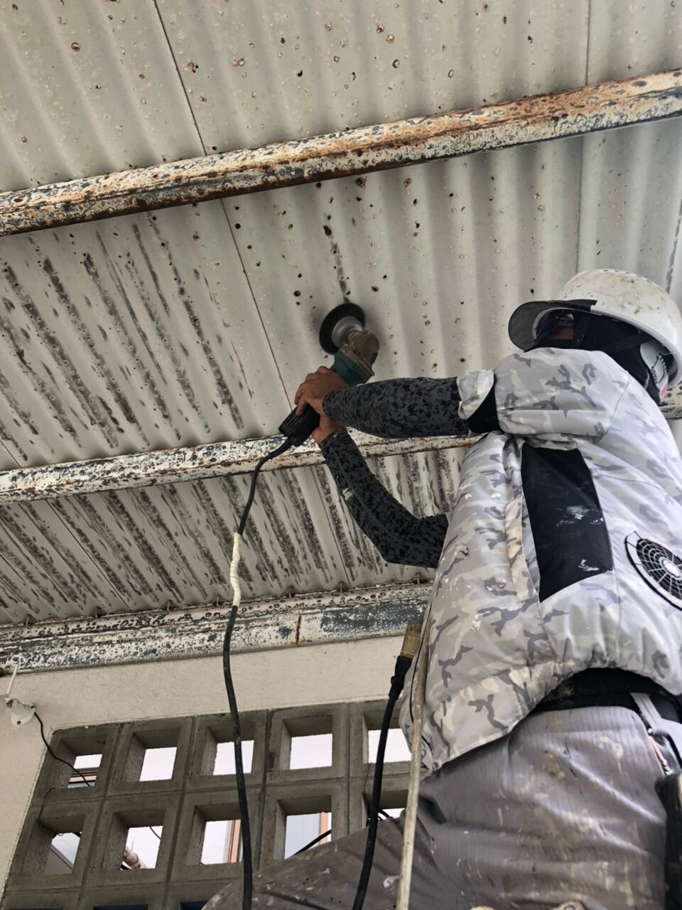 こういった鉄部は先に専用機械で研磨してサビを落としてから