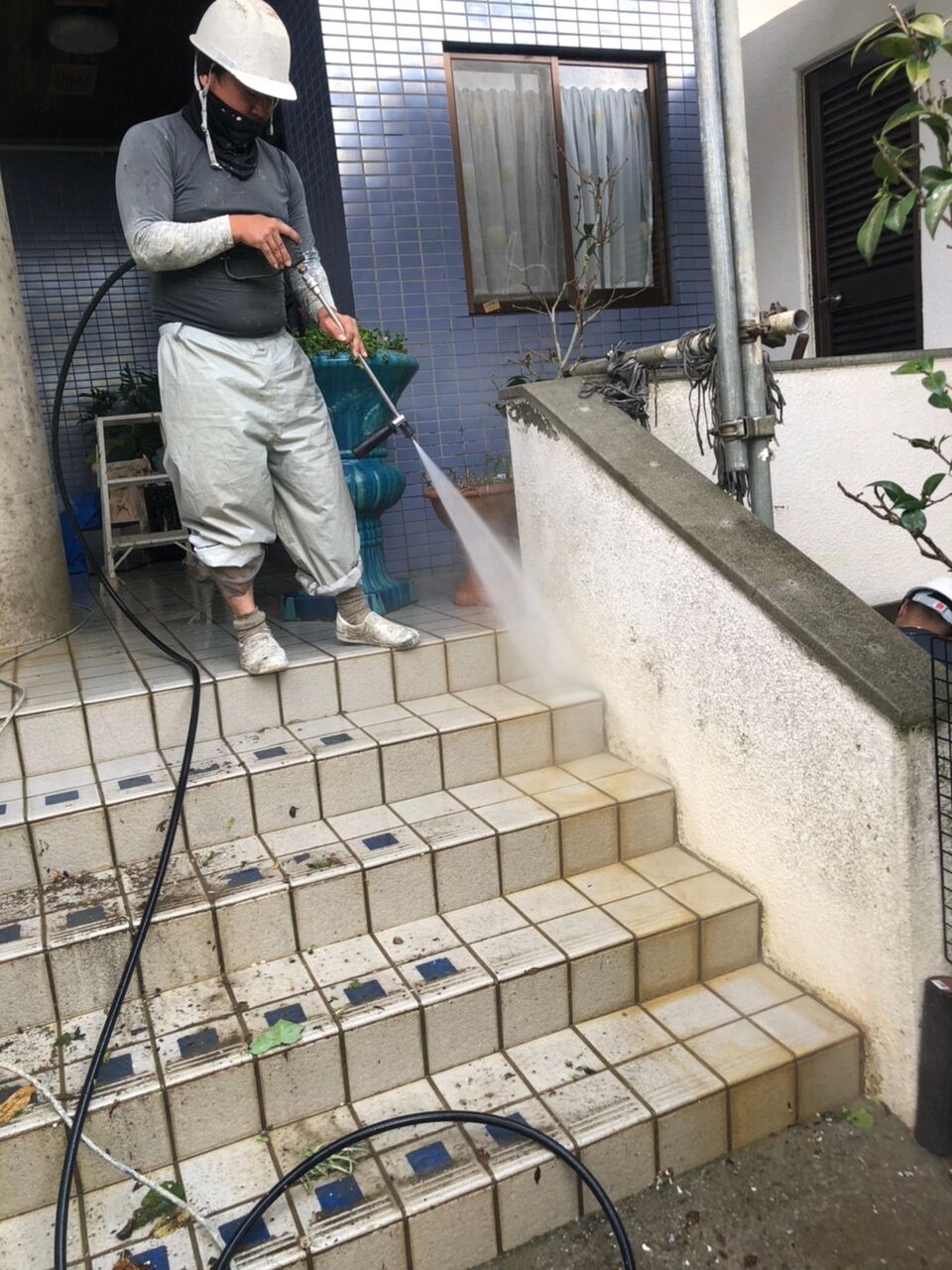 高圧洗浄機でカビや汚れ、劣化した古い塗膜などを落とすことで、