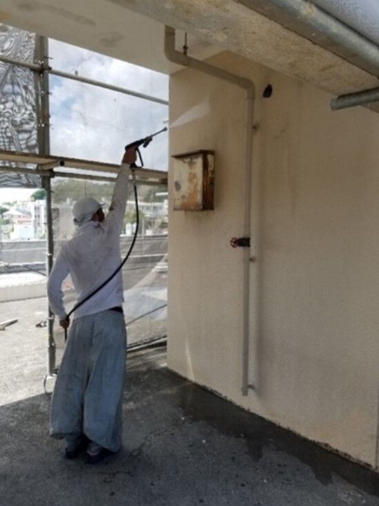 高圧洗浄機でカビや汚れ、劣化した古い塗膜などを落とすことで、