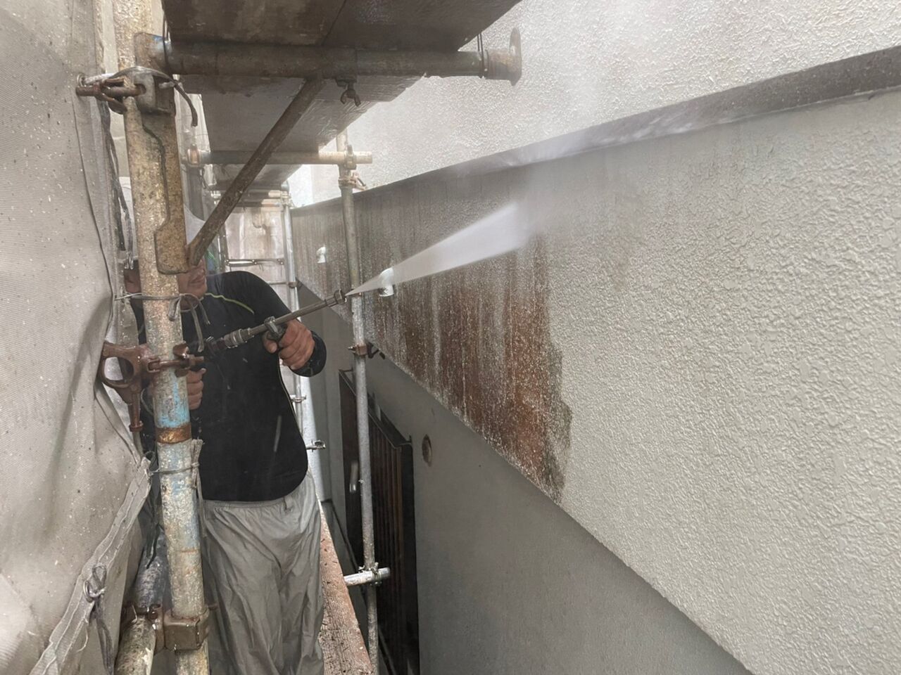 高圧洗浄機でカビや汚れ、劣化した古い塗膜などを落とすことで、