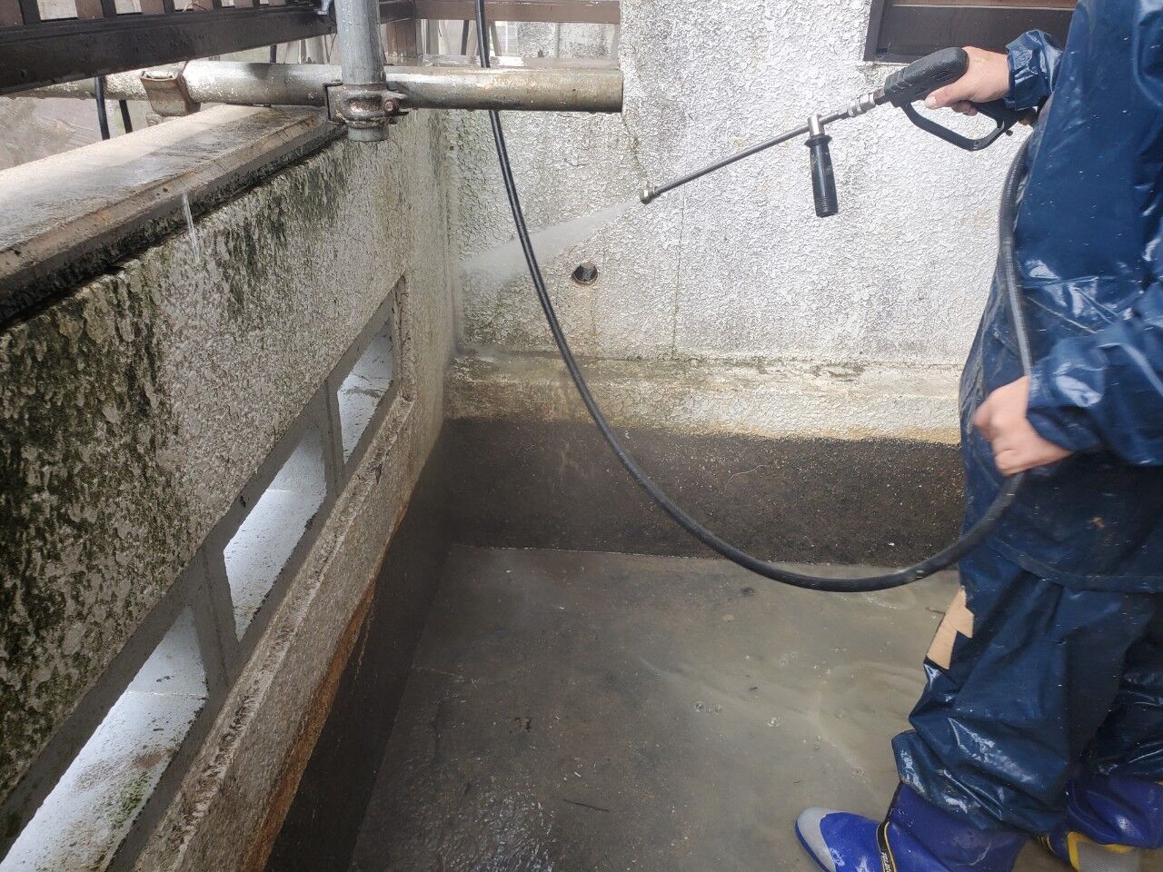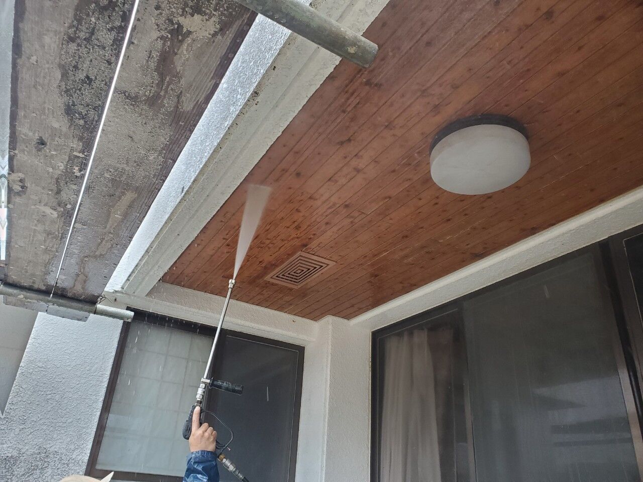 高圧洗浄機でカビや汚れ、劣化した古い塗膜などを落とすことで、