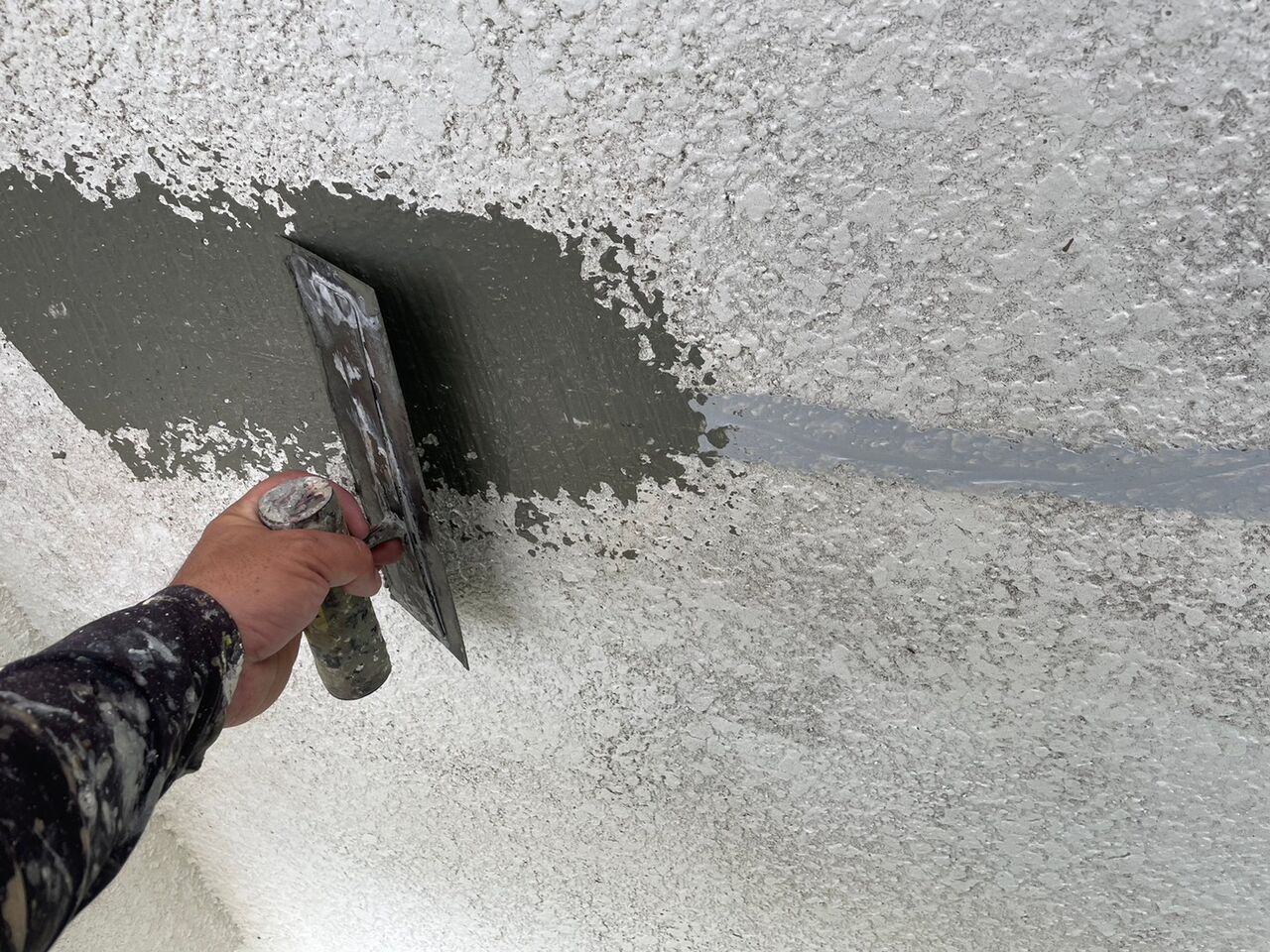 カチオン系セメントで表面を整えて補修箇所も目立たなくします。