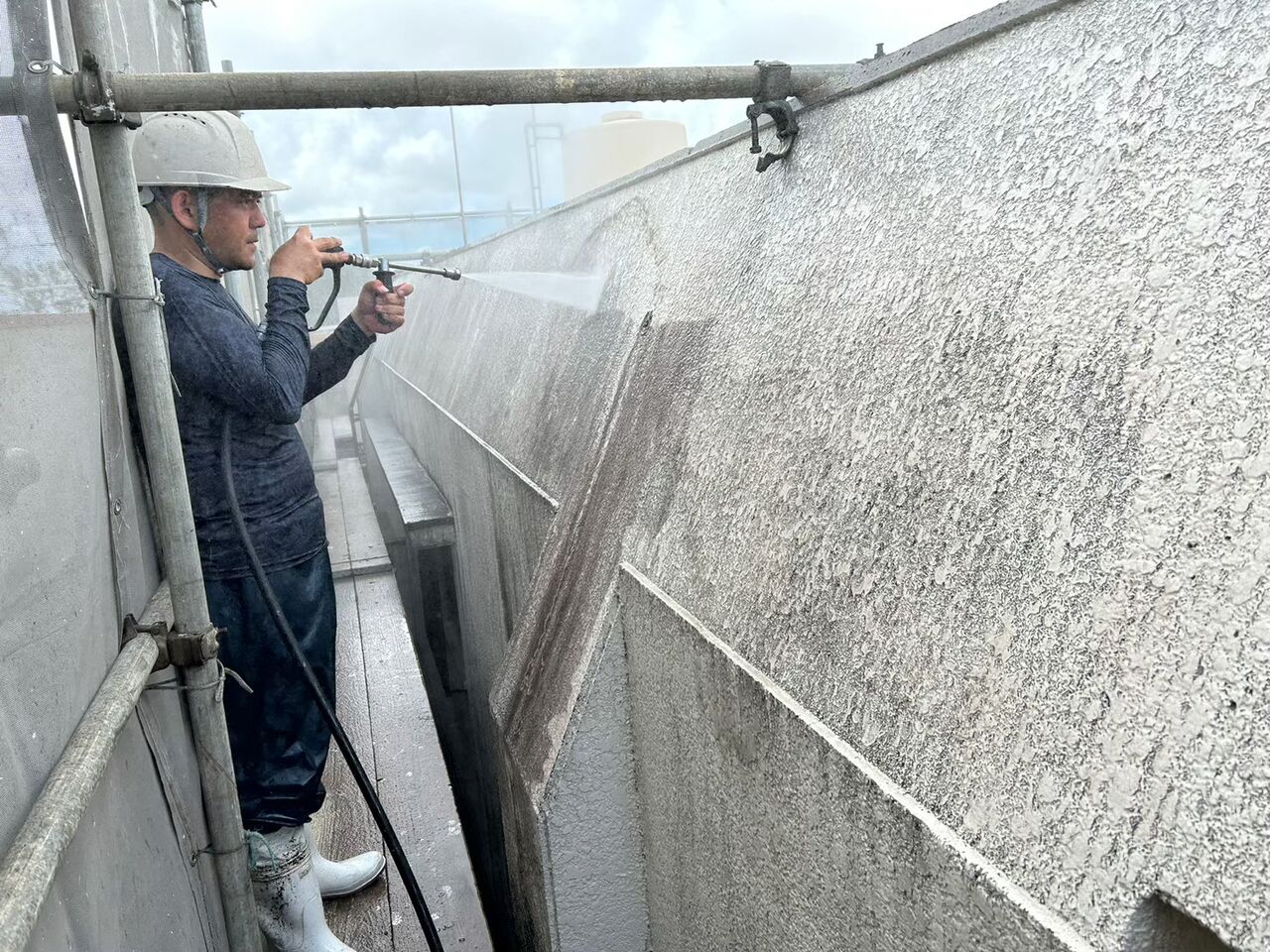 高圧洗浄機でカビや汚れ、劣化した古い塗膜などを落とすことで、